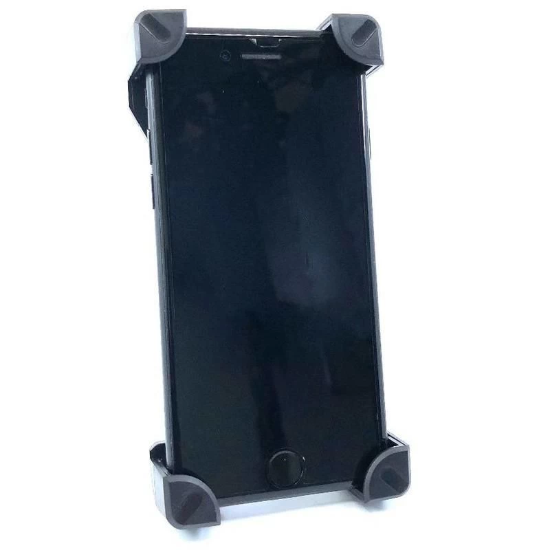 Universal phone holder with adjustable X-Grip system to grab all 4 corners of the phone and keep it secure.