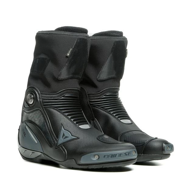 Axial GORE-TEX® is the top-of-the-range boot for the ultimate sports touring experience, combining the features of the boot used in MotoGP™ with a GORE-TEX® upper that allows the rider to take on the road whatever the weather conditions.At the heart of the boot is the Axial Distortion Control System, a technology that guides the ankle in all its movements, minimizing any kind of injury. The internal structure is made with a composition of carbon and aramid fiber, to offer the foot an extremely resistant but very lightweight shield. Containing the weight in the foot area, and at the extremities in general, is important because in case of a high side, less weight develops less centrifugal force and therefore less speed, which means the impact against the ground is significantly less violent.The Axial GORE-TEX® is designed to be worn inside the pants or suit, for a more streamlined and aerodynamic result. The GORE-TEX® membrane offers excellent waterproofing and insulation against bad weather, while maintaining optimal breathability for great comfort in every situation.