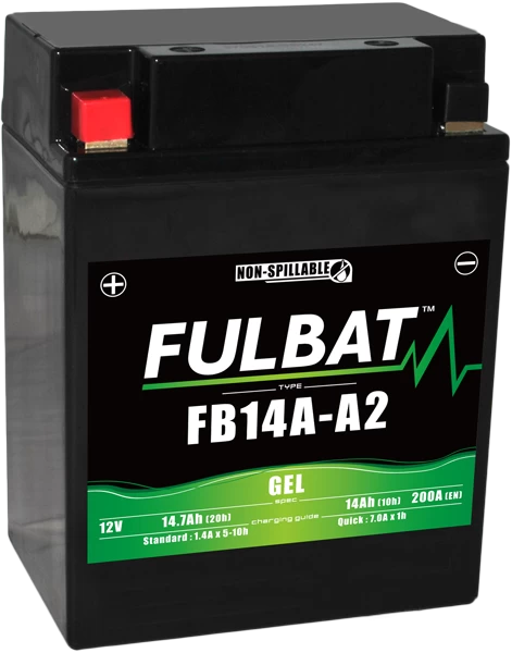 De Fulbat FB14A-A2 GEL motor accu is onderhoudsvrij. Heeft een spanning van 12V, een capaciteit van 14 Ah (10h) en een startcapaciteit van 175 A (CCA). De FB14A-A2 GEL is tot 90 graden kantelbaar. De afmetingen zijn 134 mm lang, bij 88 mm breed en 176Â mm hoog.