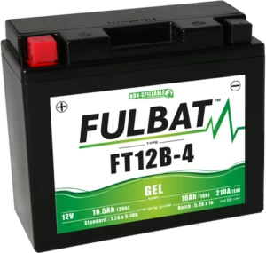 De Fulbat FT12B-4 Gel motor accu is onderhoudsvrij. Heeft een spanning van 12V, een capaciteit van 10.5Ah (20h) en een startcapaciteit van 210 A (CCA). De FT12B-4 GEL is tot 90 graden kantelbaar. De afmetingen zijn 150 mm lang, bij 69 mm breed en 130 mm hoog.