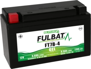 De Fulbat FT7B-4 Gel motor accu is onderhoudsvrij. Heeft een spanning van 12V, een capaciteit van 6.8Ah (20) en een startcapaciteit van 110 A (CCA). De FT7B-4 GEL is tot 90 graden kantelbaar. De afmetingen zijn 150 mm lang, bij 65 mm breed en 93 mm hoog.