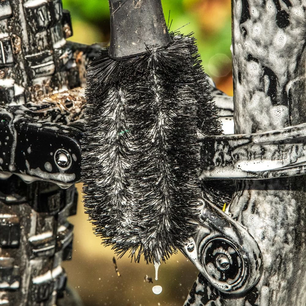 De Two Prong Brush heeft twee borstels die je zelf kunt verstellen om bij de beste plekken te komen en is ideaal voor het verwijderen van vuil op je spaken, remschijven en schokbrekers.